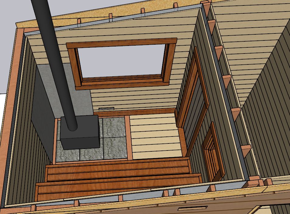 These and other elements of a sauna hot room can be done a variety of different ways, with different price points. Non-combustibles around the stove can be sheet metal, tile, or stone, for example; the hot room door could be glass or wood, with or without a window, and custom built by us or a sauna accessory retailer in the region. Same goes for vent covers and windows. Towel racks and other optional items we typically leave to you to select and install after our work is done.