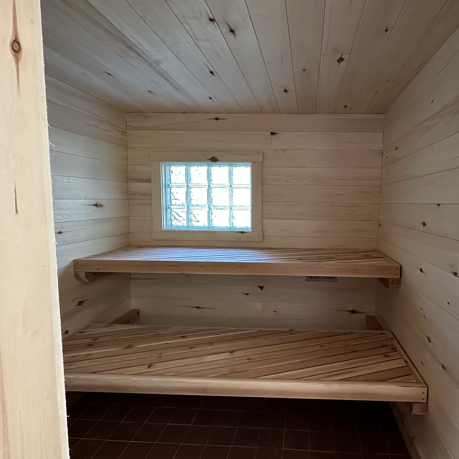 Depending on the location of your sauna, there are different flooring options. These include open deck flooring, concrete slab with removable duckboards, tile, or raised wood flooring. We recommend a sloped floor with a drain where practicable, but we can build a hot room without a drain that will still hold up with proper maintenance and cleaning.